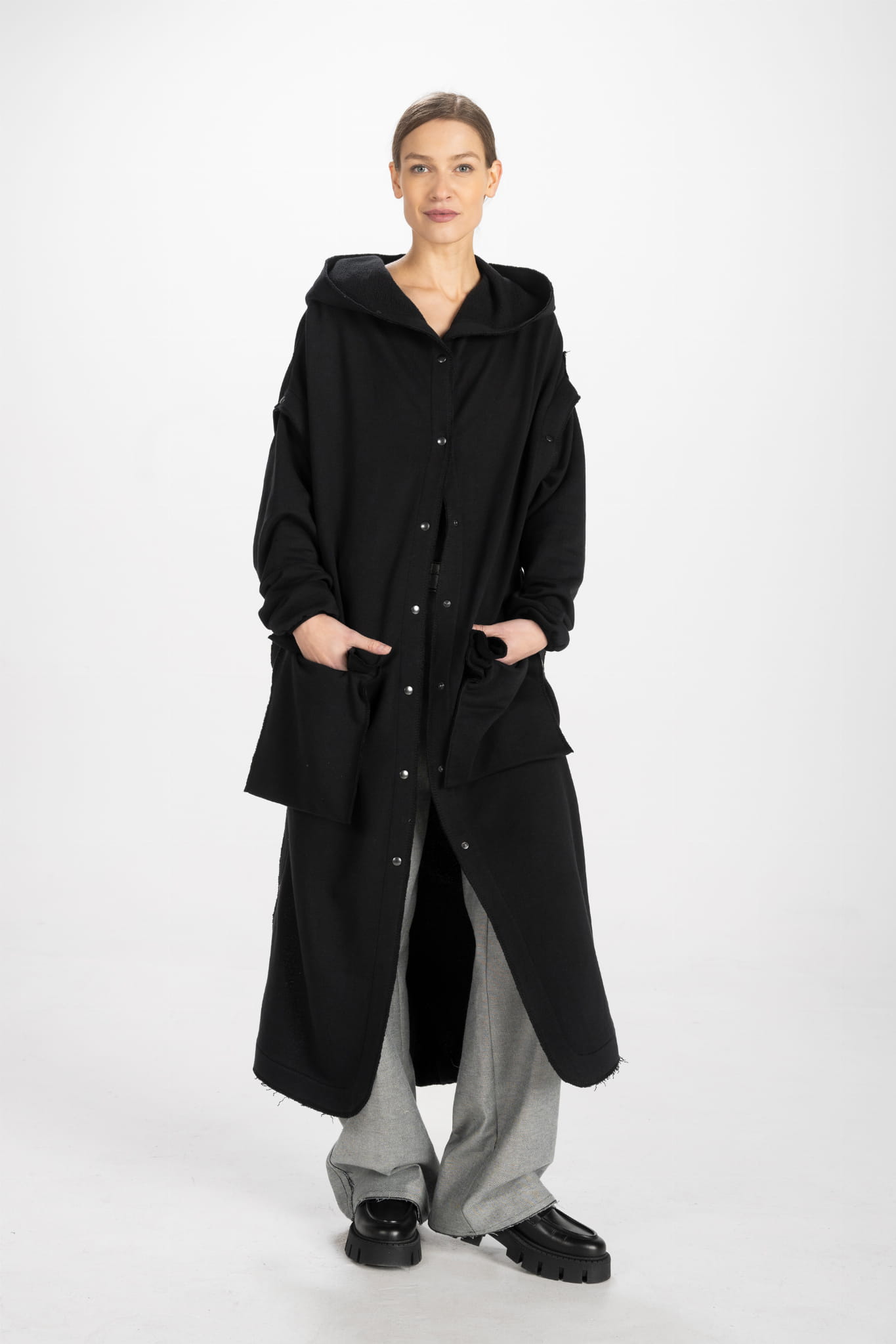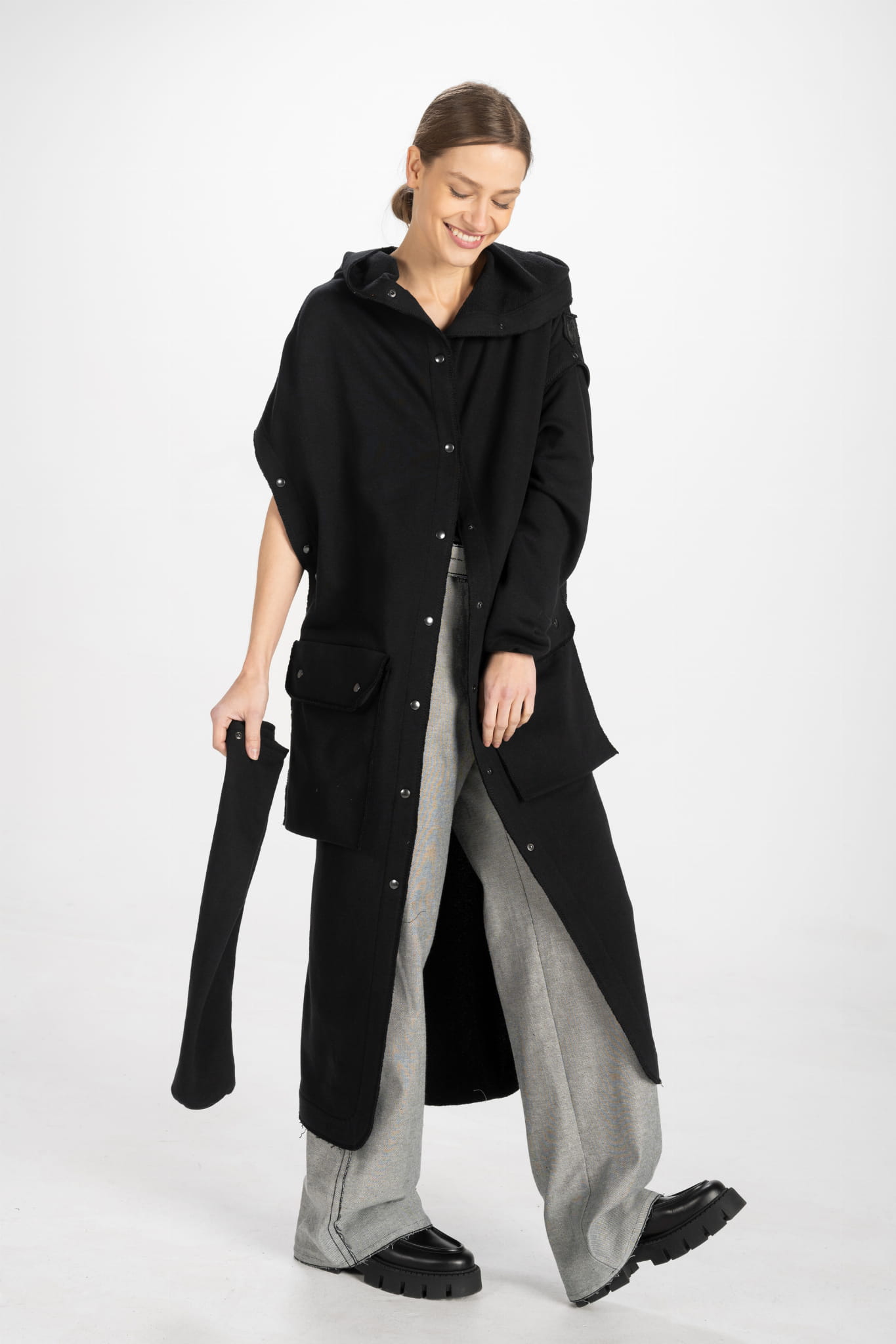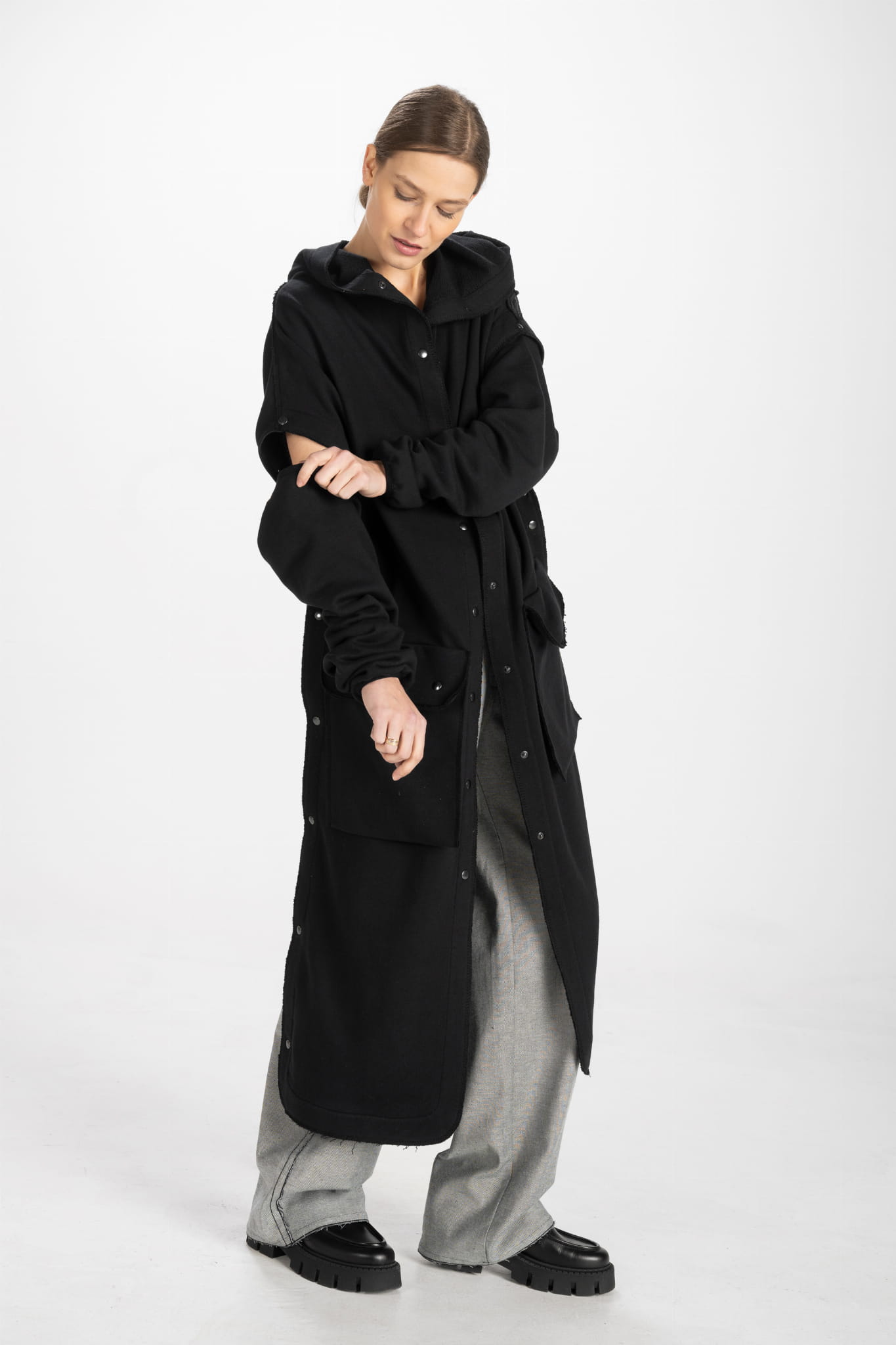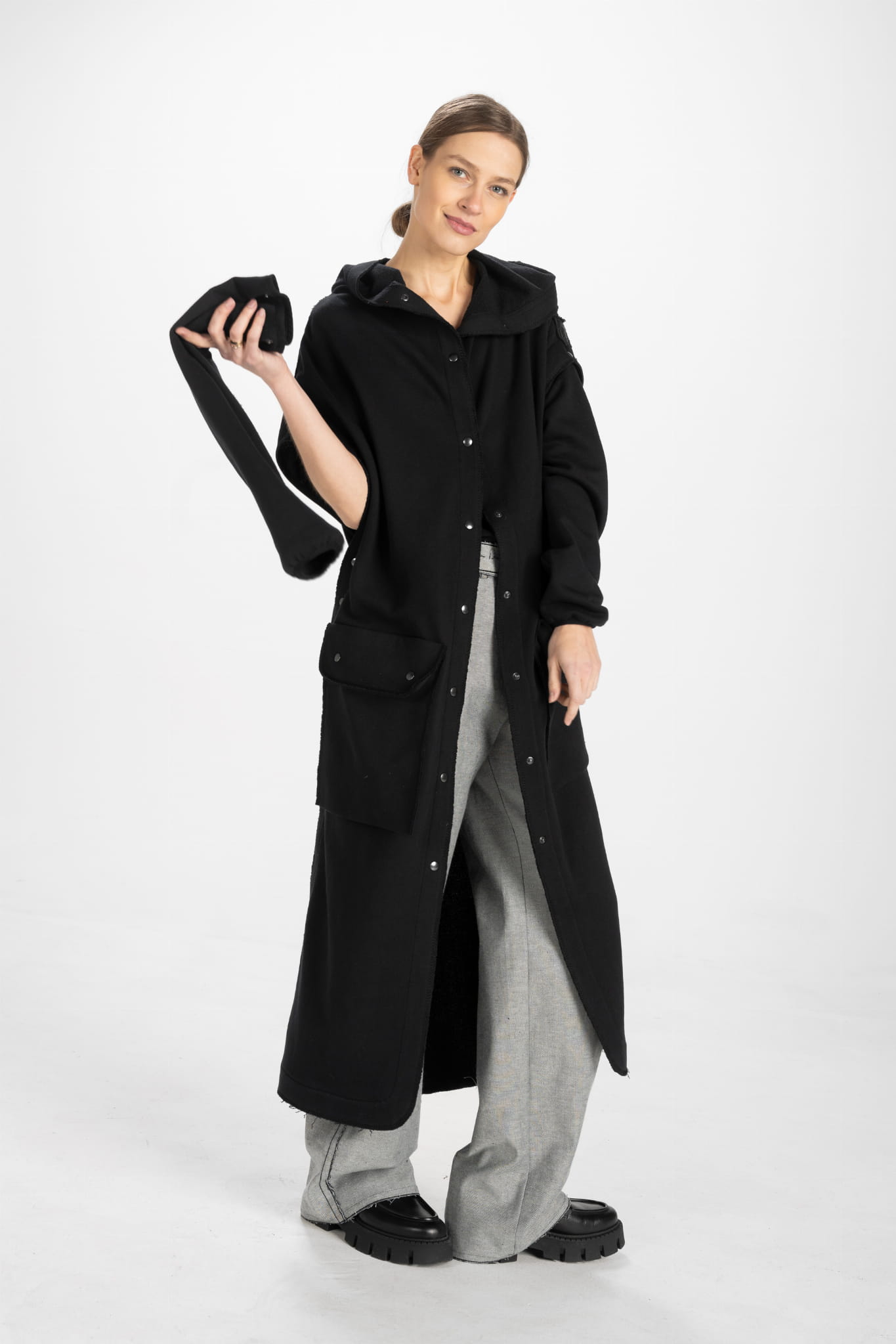 Niesamowicie uniwersalna długa płaszczo-bluza z dresowej dzianiny, która po odpięciu rękawów zmienia się w kamizelkę