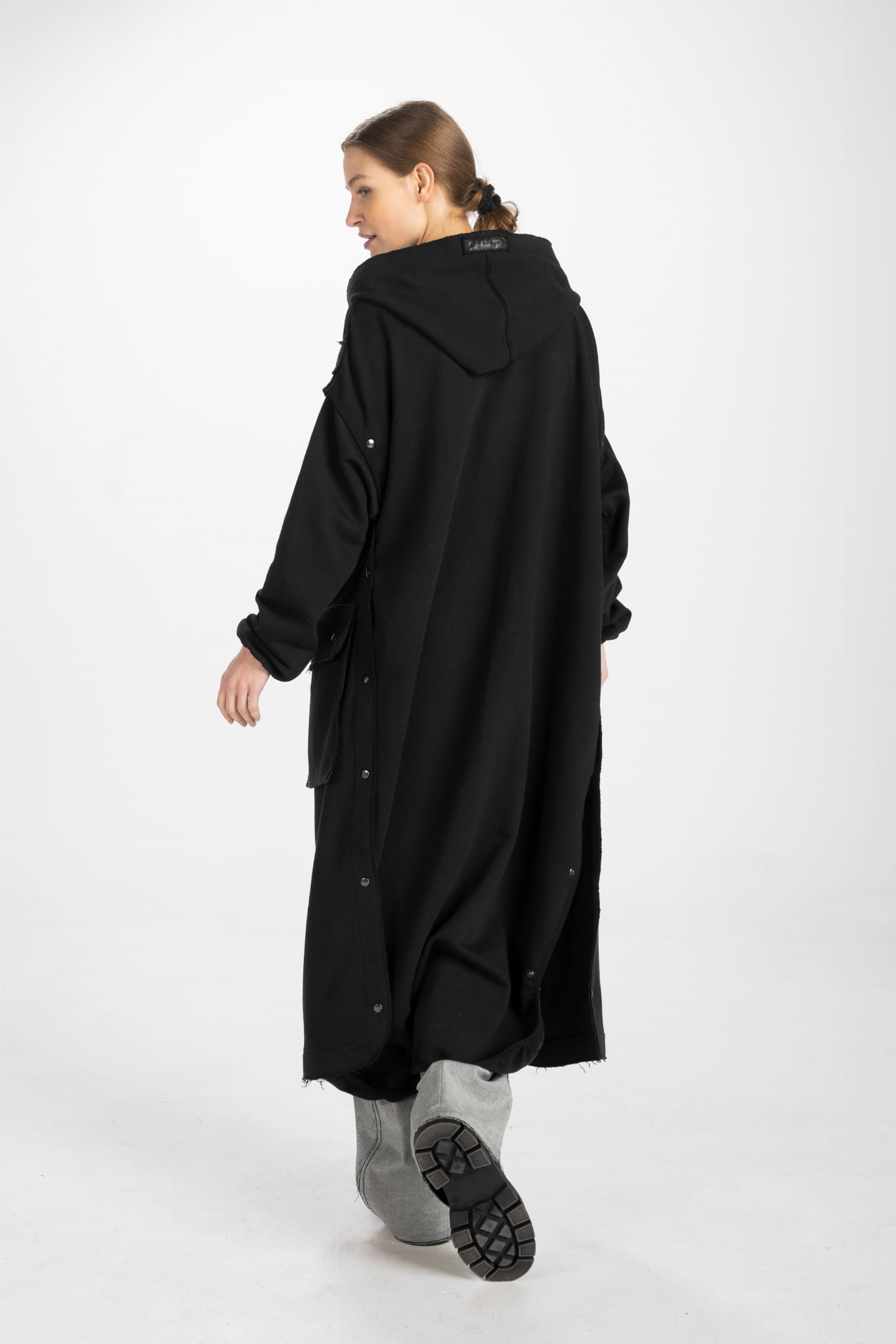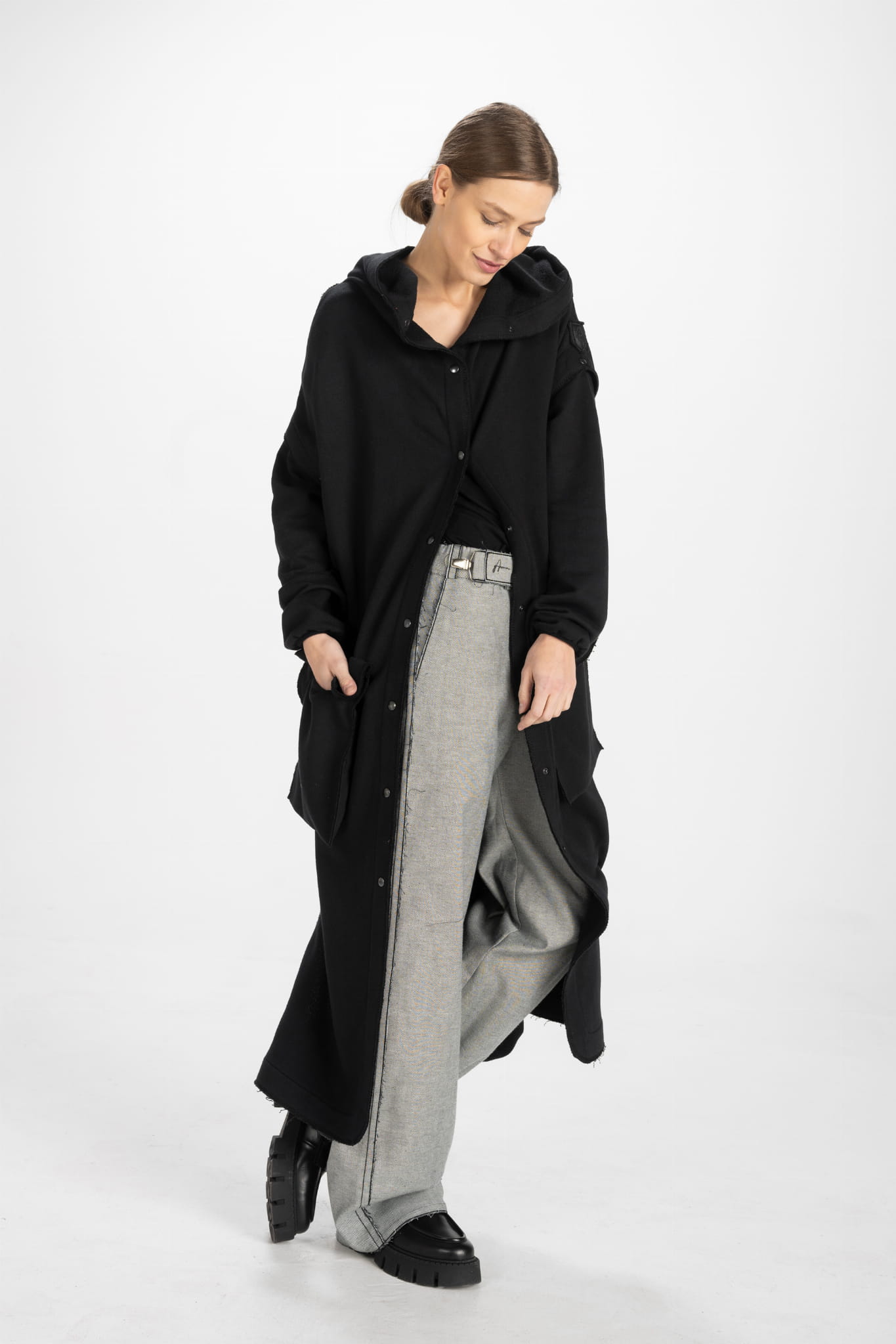 - Skórzana naszywka z logo projektantki na kapturze