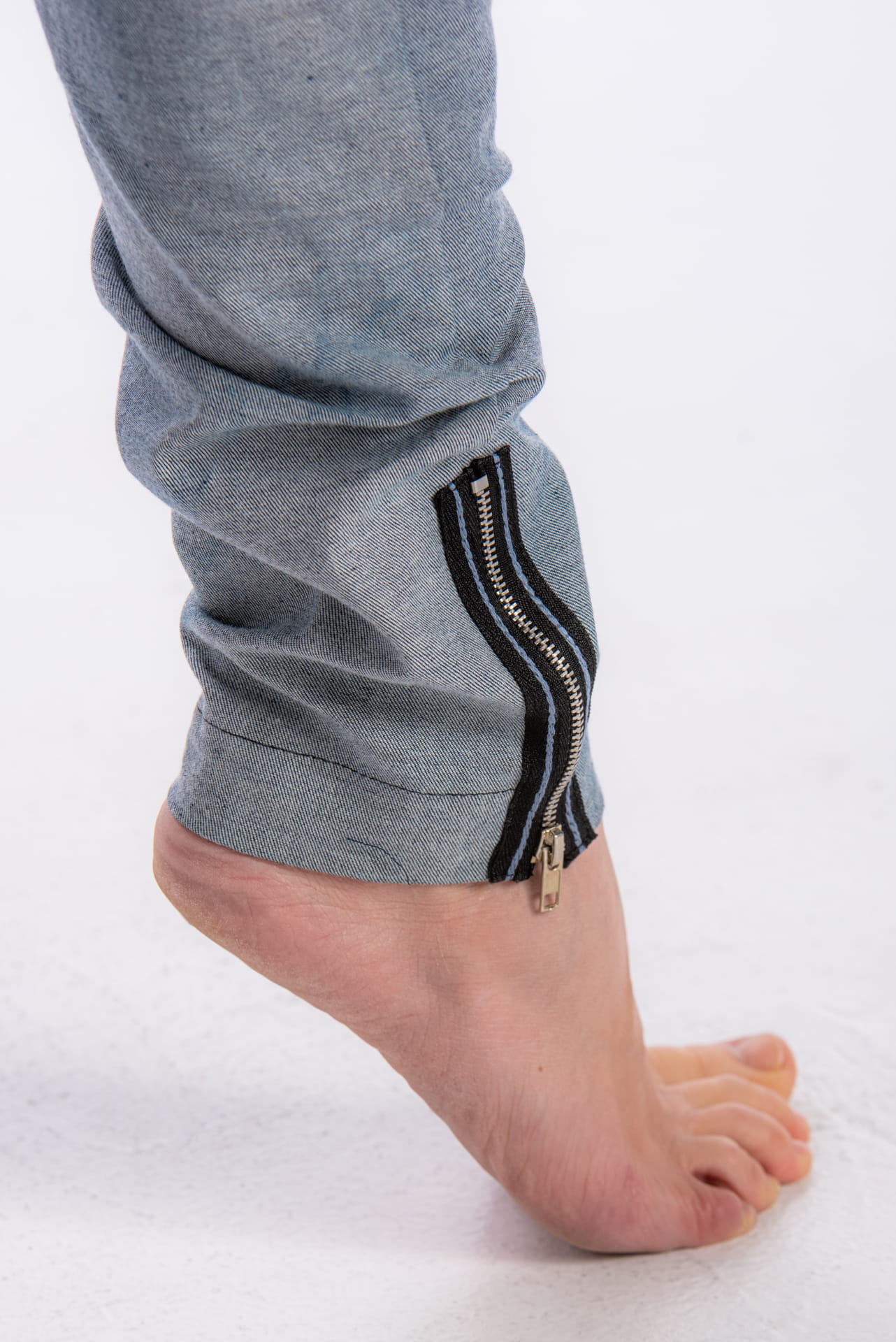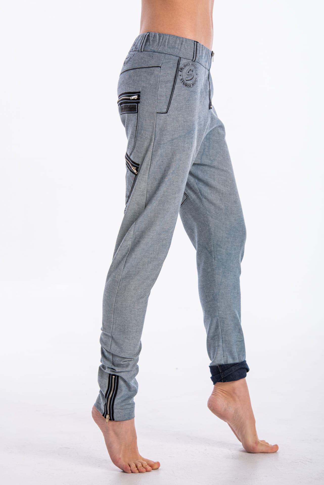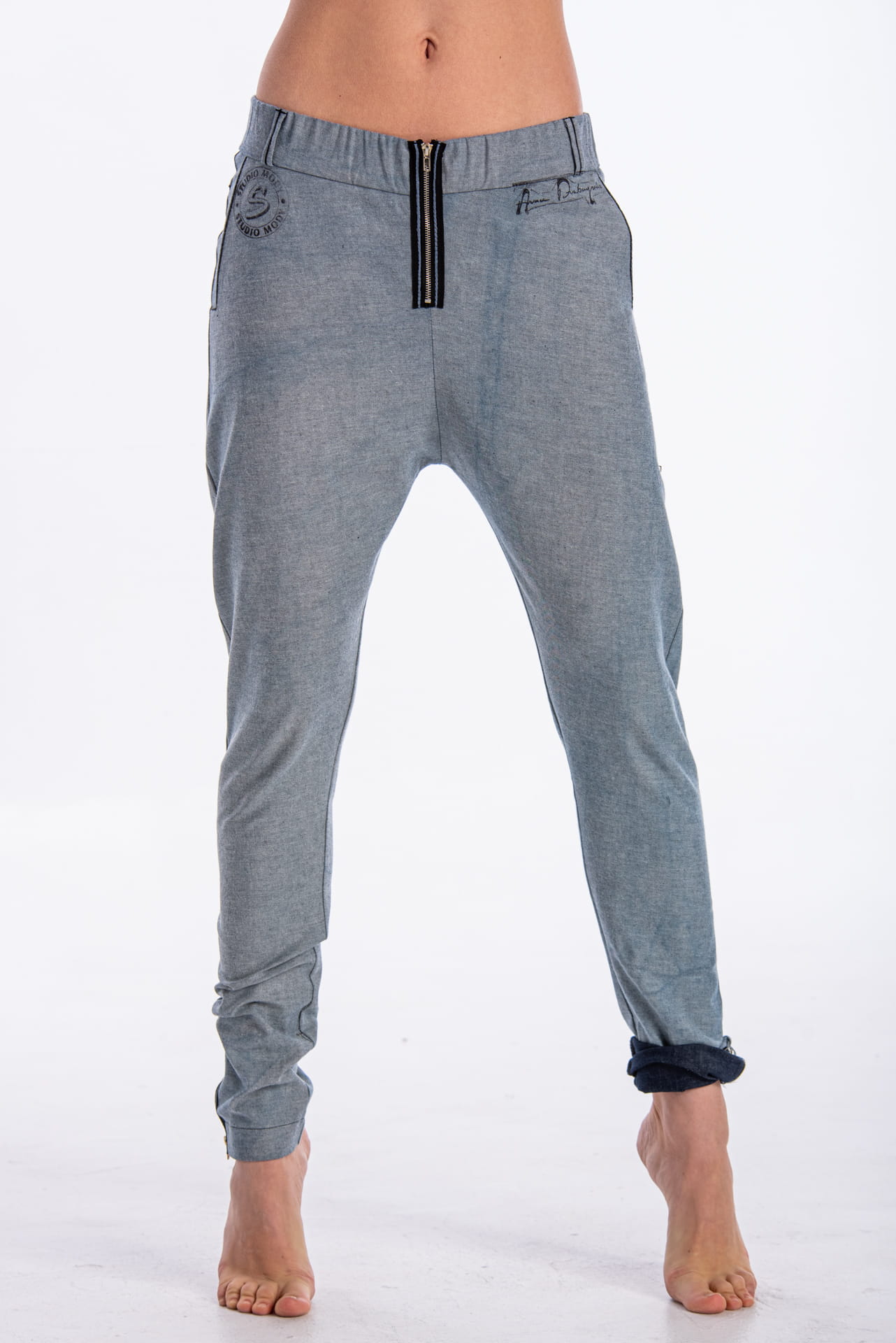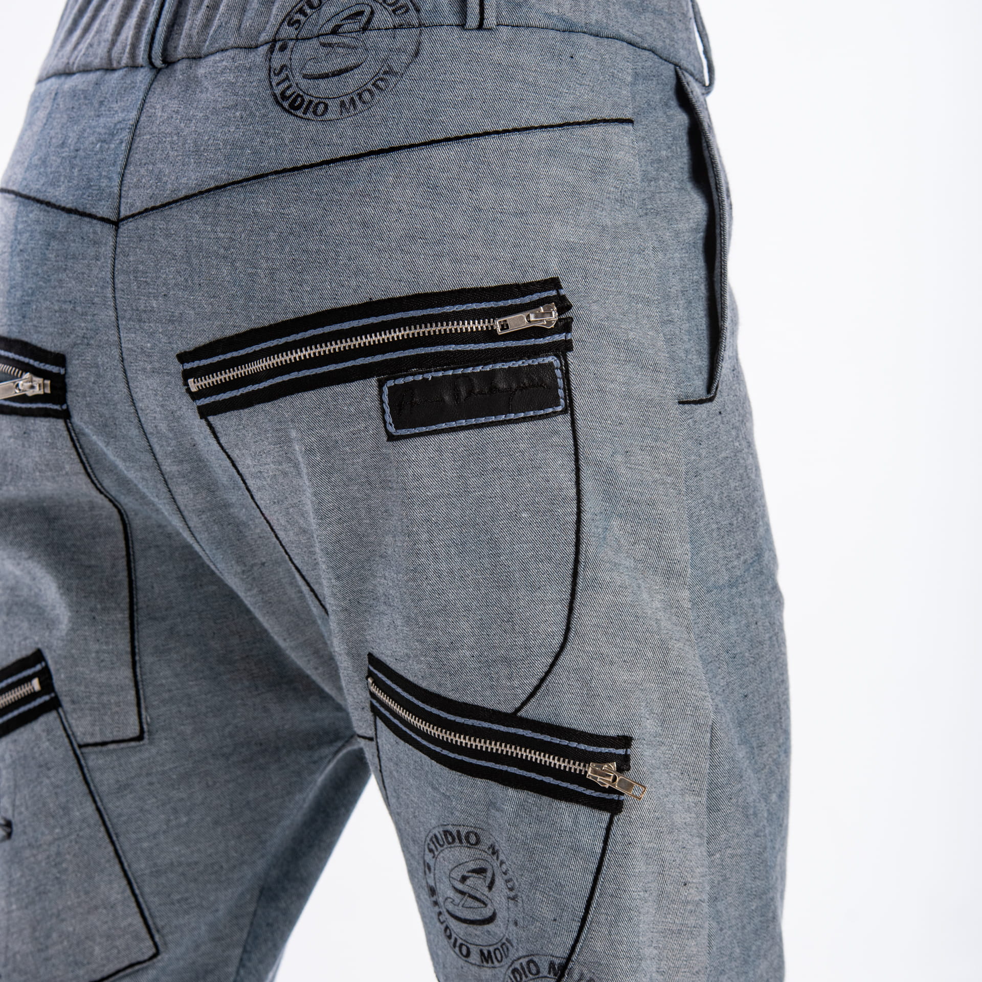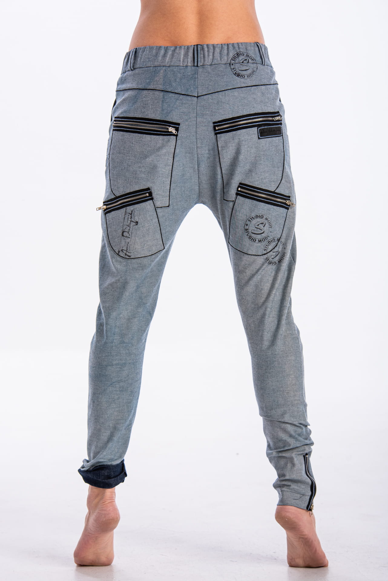 - Ozdoby w postaci licznych pieczątek i czarnych przeszyć, a także zamki na kieszeniach i nogawkach dodają spodniom oryginalności – w tym modelu na pewno nie zginiesz w tłumie!