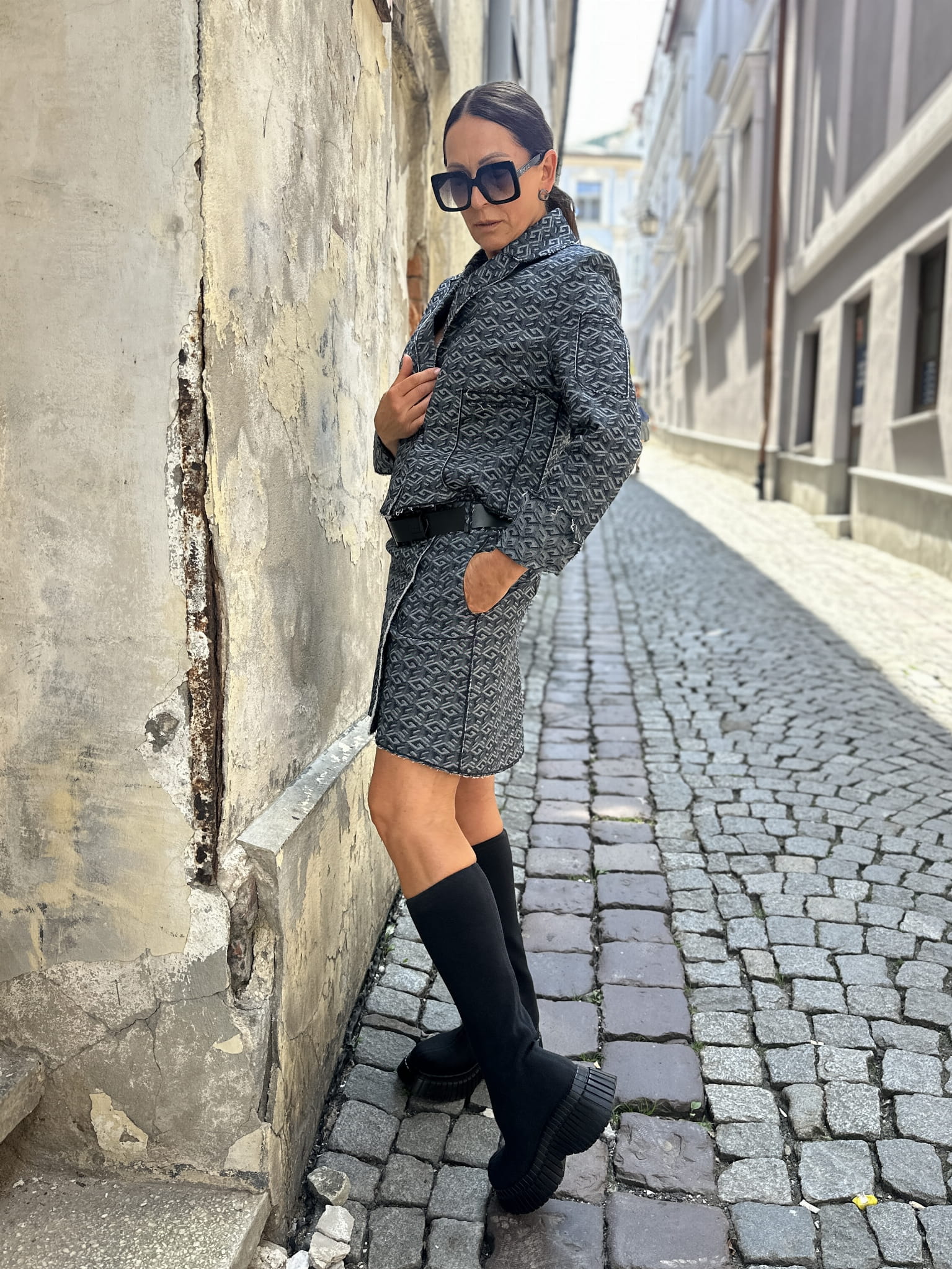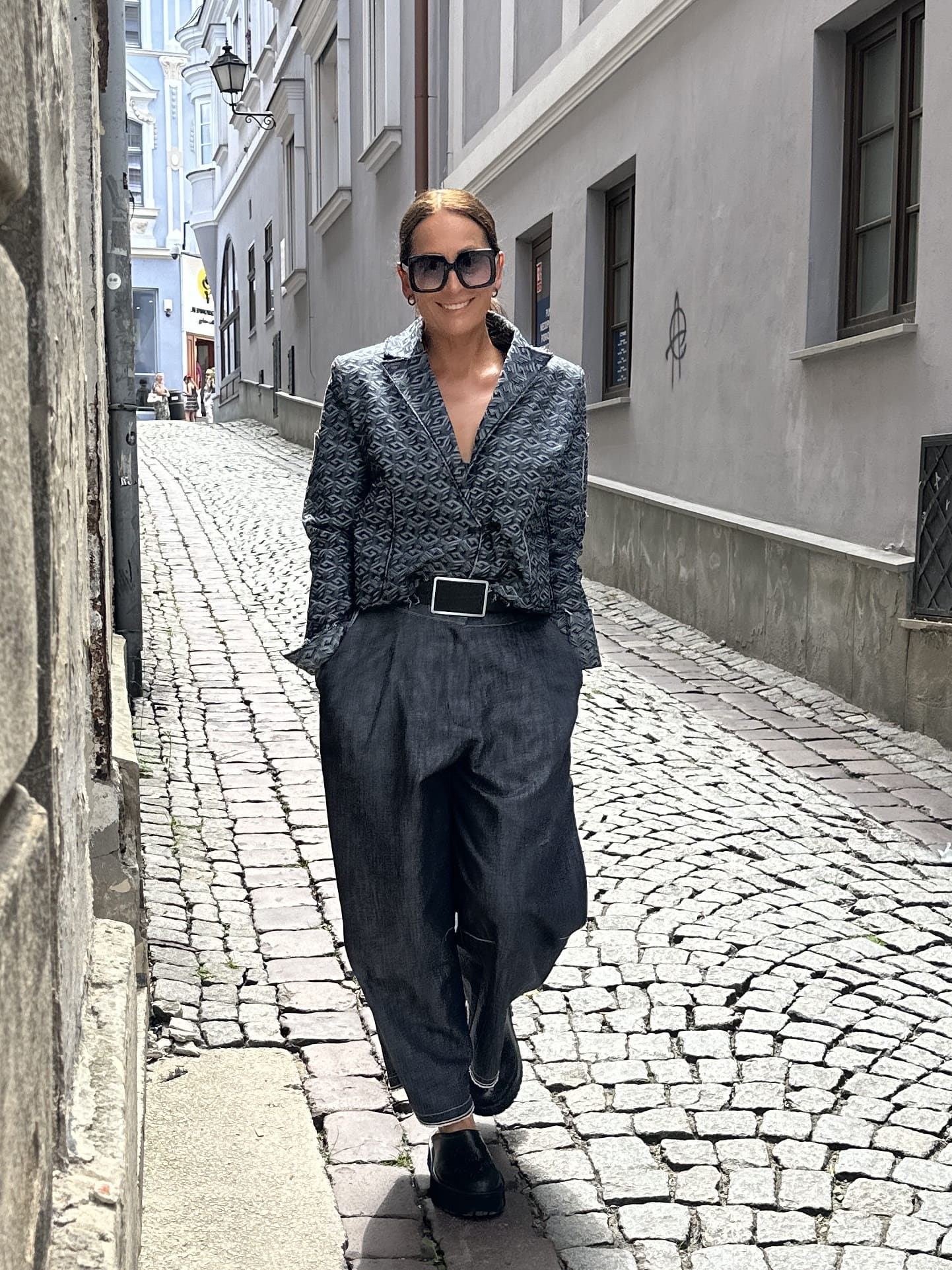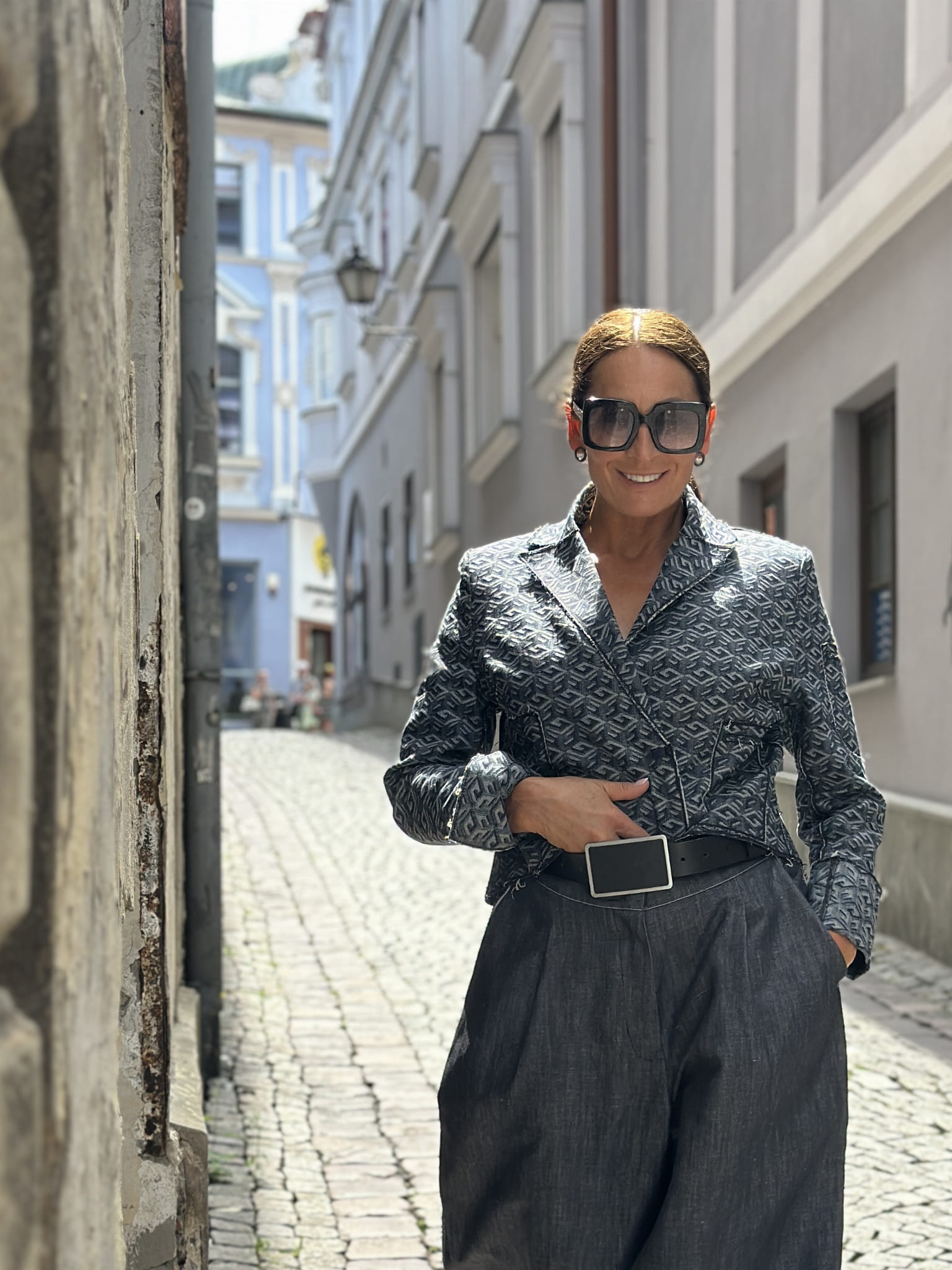 - Ciekawy, geometryczny deseń tkaniny sprawia, że marynarka pasuje do różnych kolorów jeansów.