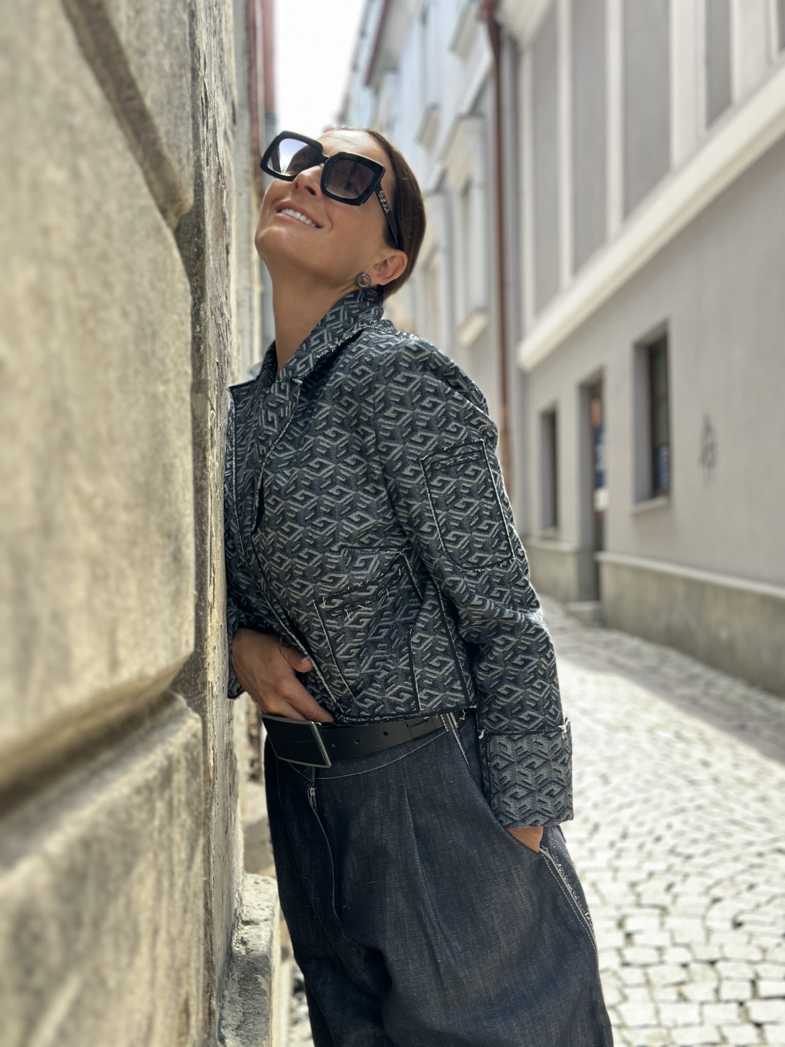 Krótka marynarka jeansowa w geometryczny deseń