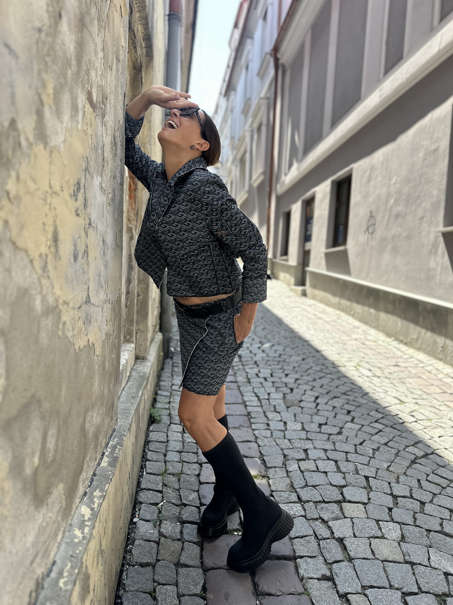 - Pasuje do krótkiej spódniczki (dostępna jako oddzielny element zestawu) czy szortów, świetnie się komponuje ze spodniami.