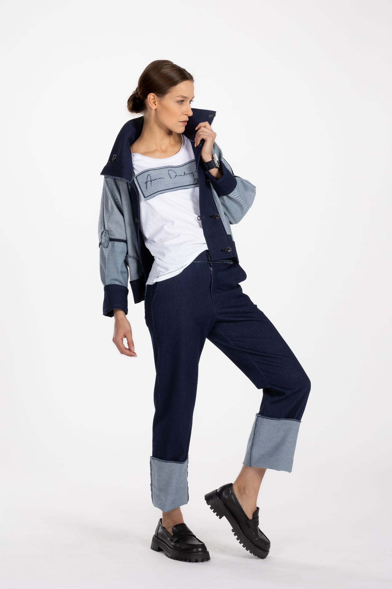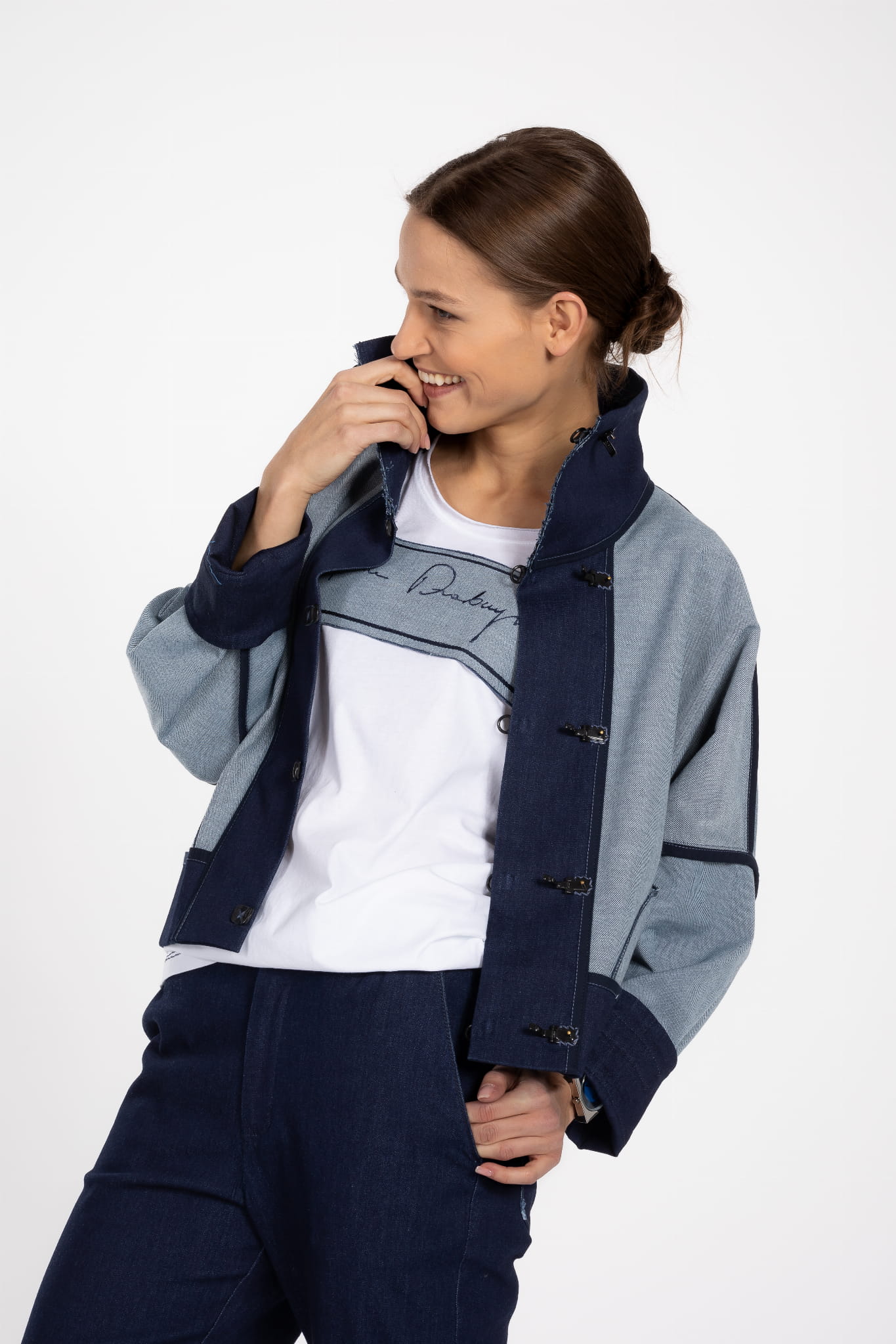 Krótka dwustronna kurtka jeansowa z kołnierzem i eleganckim zapięciem na artystyczne haftki